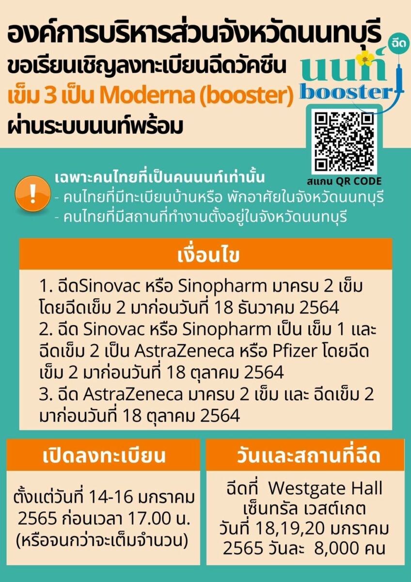 โดยมีข้อความเฟซบุ๊กระบุว่า “องค์การบริหารส่วนจังหวัดนนทบุรี ขอเรียนเชิญลงทะเบียนฉีดวัคซีนเข็ม 3 เป็น Moderna (booster) ผ่านระบบนนท์พร้อม