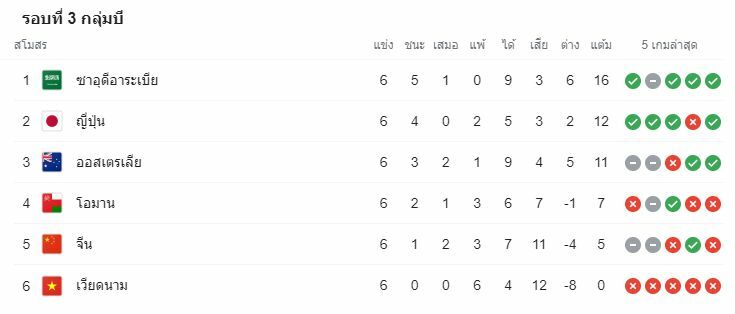 - 07/09/21 แพ้ ญี่ปุ่น 0-1 (เหย้า, ฟุตบอลโลก รอบคัดเลือก)