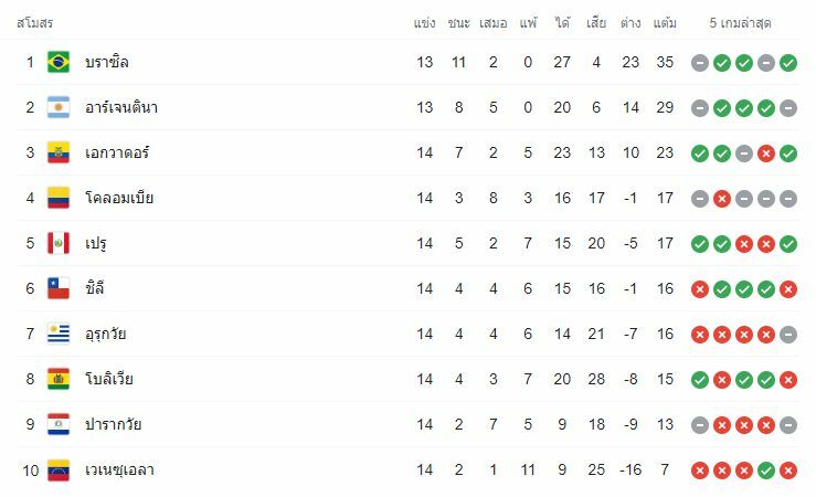 - 14/10/21 แพ้ บราซิล 1-4 (เยือน, ฟุตบอลโลก รอบคัดเลือก)