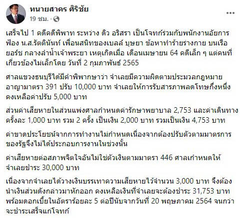 ดิว อริสรา ชนะคดีถูกทำร้ายร่างกายบนเรือยอชต์ ศาลสั่ง เบล บุษยา ชดใช้ 30,000 บาท