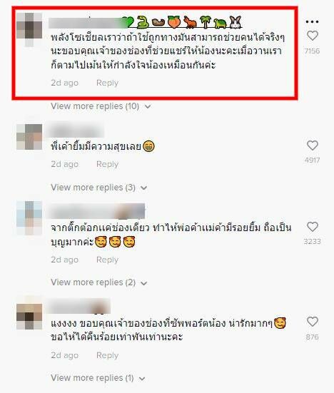 ขณะเดียวกัน พ่อค้าไลฟ์ขายรองเท้ามือสองคนดังกล่าวที่บอกว่าจากนี้จะขอหันมาเอาดีทางด้านไลฟ์อย่างเต็มตัว ไม่ลืมที่จะกล่าวขอบคุณอย่างจริงใจกับพี่สาวคนหนึ่งซึ่งเป็นจุดเริ่มต้นของเรื่องราวทั้งหมด ที่นำเรื่องของเขามาเผยแพร่บนโลกออนไลน์ซึ่งเธอคนนี้ก็คือคนเดียวกับที่ใช้บัญชี Tiktok ที่ชื่อ @chompoo1450 ซึ่งโพสต์คลิปตอนที่ปื๊ดยังไลฟ์ขายของไม่ได้ แต่เธอก็ช่วยสนับสนุน โดยนอกจากช่วยซื้อรองเท้าไป 5 คู่แล้ว ยังแปะชื่อเฟซบุ๊กเพจ รองเท้ามือสองของแท้p&n ของปื๊ดให้ จนนาทีนี้มีคนติดตามเข้ามาให้กำลังใจและคอยอุดหนุนสินค้าไม่ขาด