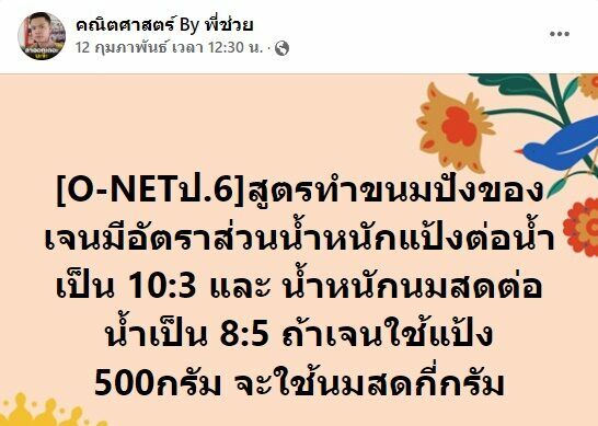 โดยข้อที่ถูกพูดถึงมากคือ ‘สูตรทำขนมปังของเจน’ ซึ่งโจทย์ได้ระบุว่า “สูตรทำขนมปังของเจนมีอัตราส่วนน้ำหนักแป้งต่อน้ำเป็น 10:3 และ น้ำหนักนมสดต่อน้ำเป็น 8:5 ถ้าเจนใช้แป้ง 500กรัม จะใช้นมสดกี่กรัม” ซึ่งทางเพจได้แสดงความคิดเห็นต่อข้อสอบว่านี่คือการออกข้อสอบเกินหลักสูตร และข้อสอบในลักษณะนี้ควรเป็นข้อสอบ ม.1 ก่อนที่จะอธิบายวิธีการหาคำตอบของข้อนี้