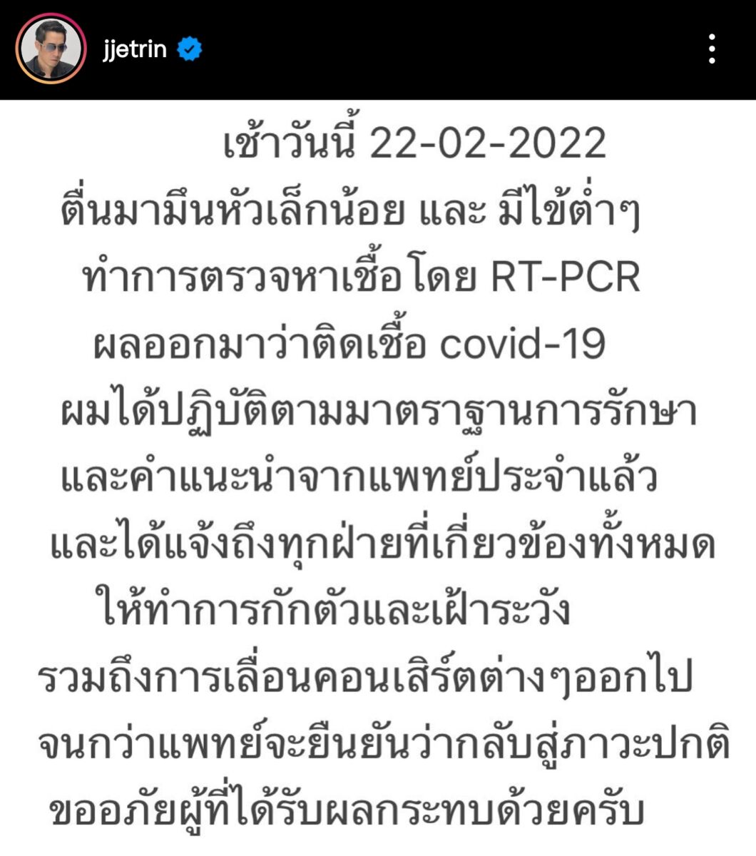 วันนี้ 22 ก.พ. 2565 เจ เจตริน วรรธนะสินได้โพสต์อัปเดตผ่านไอจีส่วนตัว ระบุว่า ตนเองติดเชื้อโควิค 19 เนื่องจากตื่นเช้ามามีอาการมึนหัว และมีไข้ต่ำ ๆ จึงทำการตรวจ covid ด้วยวิธี RT-CPR ปรากฎว่าผลโควิดเป็นบวก