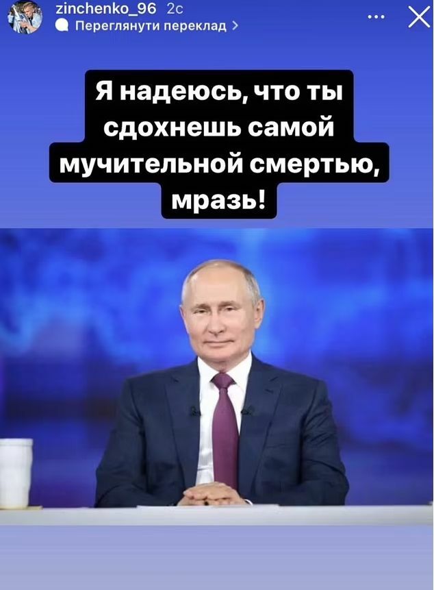 ล่าสุดดาวเตะวัย 25 ปีได้โพสต์ภาพลงสตอรี่ ในอินสตาแกรม เป็นภาพของ ปูติน พร้อมข้อความว่า “ฉันหวังให้แกตายแบบทุกข์ทรมานที่สุด ไอ้คนที่ไม่ใช่มนุษย์”