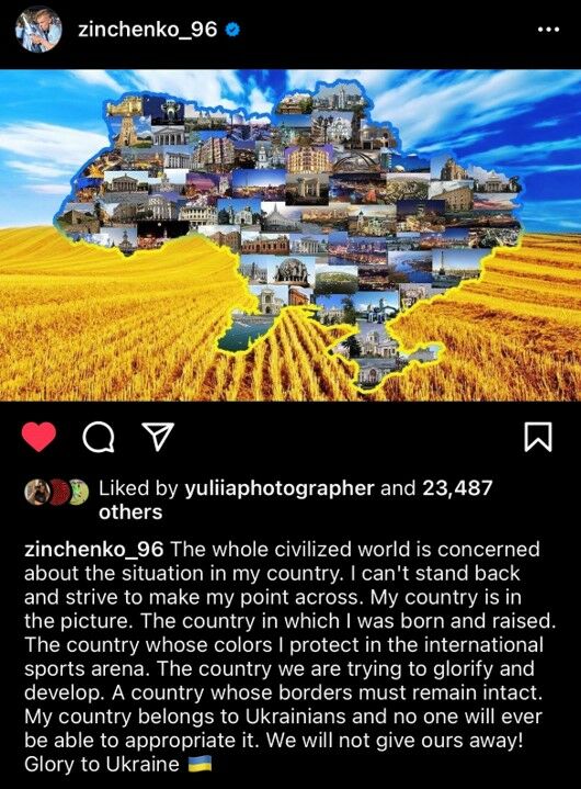 ทำให้เมื่อวานนี้ (23 กุมภาพันธ์) โอเล็กซานเดอร์ ซินเชนโก้ ได้โพสต์ภาพลงในอินสตาแกรมส่วนตัว พร้อมข้อความในเชิงว่า ตัวเขาสนับสนุน ยูเครน บ้านเกิดของเขา และไม่เห็นด้วยกับการกระทำของประเทศเพื่อนบ้านอย่าง รัสเซีย