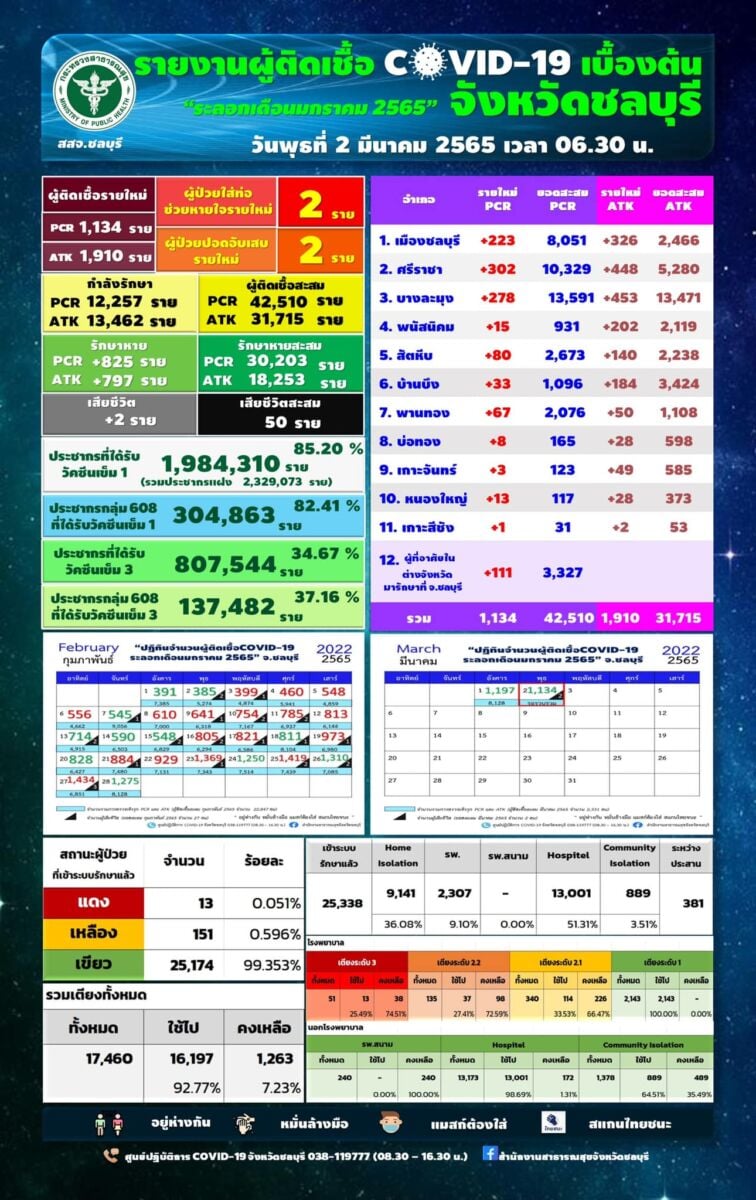 สสจ.ชลบุรี รายงานสถานการณ์ยอดผู้ติดเชื้อ โควิดชลบุรีวันนี้ 2 มี.ค. 65 จังหวัดชลบุรี ติดเชื้อเพิ่ม 3,044 ราย มีผู้เสียชีวิตเพิ่ม 2 ศพ