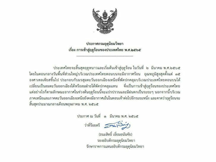 กรมอุตุนิยมวิทยา ได้เผยแพร่ประกาศที่ว่าด้วยเรื่อง การเข้าสู่ฤดูร้อนของประเทศไทย พ.ศ.2565 โดยระบุว่า “ประเทศไทยจะสิ้นสุดฤดูหนาวและเริ่มต้นเข้าสู่ฤดูร้อน ในวันที่ 2 มีนาคม พ.ศ. 2565 โดยในตอนกลางวันพื้นที่ส่วนใหญ่บริเวณประเทศไทยตอนบนจะมีอากาศร้อน อุณหภูมิสูงสุดตั้งแต่ 35 องศาเซลเซียสขึ้นไป