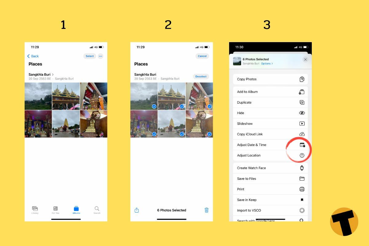 นอกจากนี้ IOS 15 ยังสามารถใช้ในการเปลี่ยนข้อมูลวันเวลา และสถานที่ของภาพถ่ายหลาย ๆ ภาพพร้อมกัน ด้วยการกดปุ่มเลือก หรือ Select ในแบบภาษาอังกฤษ ต่อด้วยการกดปุ่มแชร์ ตามด้วยการเลือเมนู “ปรับวันที่และเวลา” รวมถึง “ปรับตำแหน่งที่ตั้ง” แล้วทำตามวิธีการด้านบนได้เลย