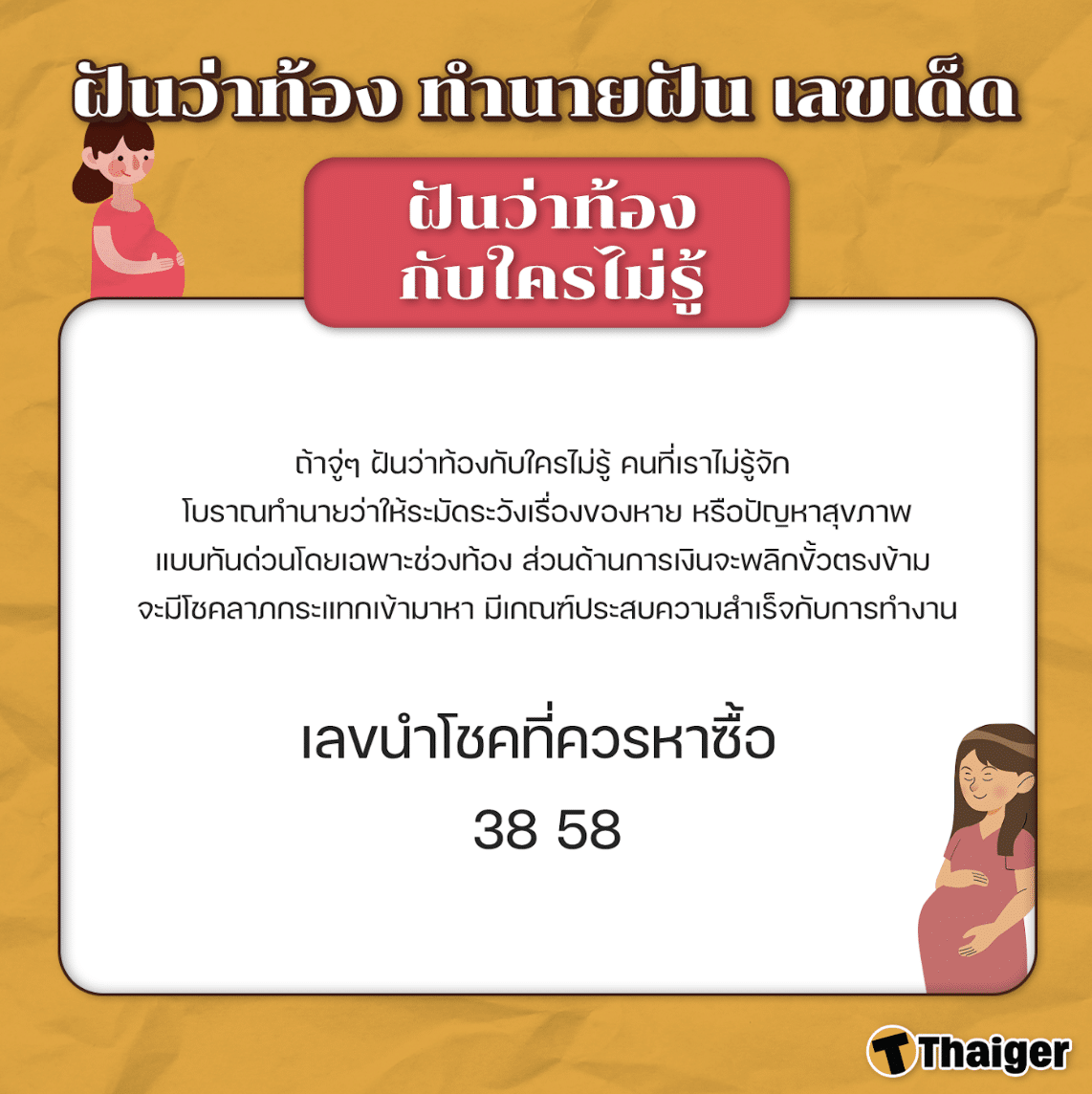 ถ้าจู่ๆ ฝันว่าท้องกับใครไม่รู้ คนที่เราไม่รู้จัก โบราณทำนายว่าให้ระมัดระวังเรื่องของหาย หรือปัญหาสุขภาพแบบทันด่วนโดยเฉพาะช่วงท้อง ส่วนด้านการเงินจะพลิกขั้วตรงข้าม จะมีโชคลาภกระแทกเข้ามาหา มีเกณฑ์ประสบความสำเร็จกับการทำงาน