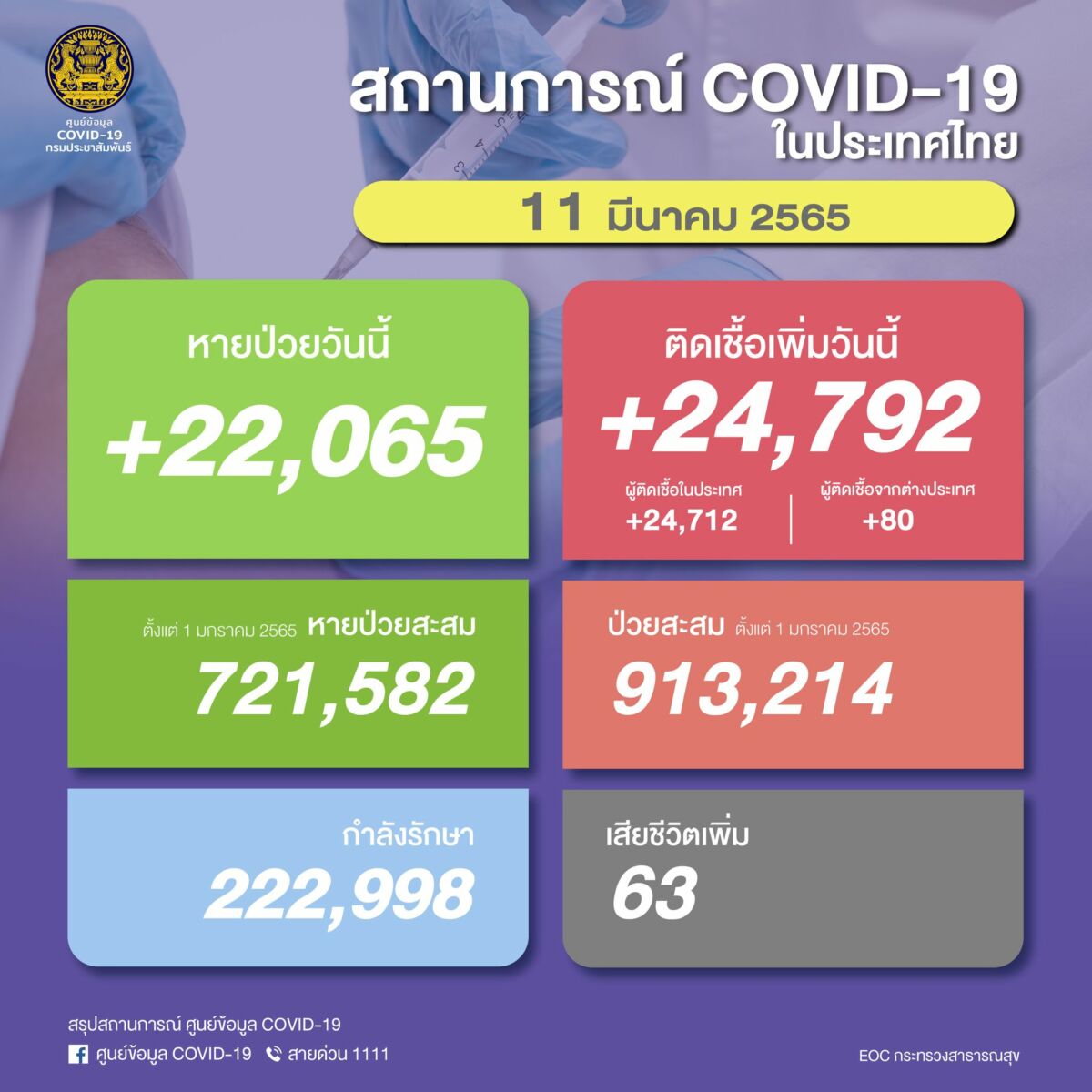 โควิดไทยวันนี้ 11 มี.ค. 65 ติดเชื้อเพิ่ม 24,792 ราย ดับ 63 ศพ