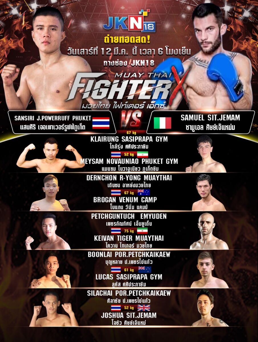 รายการมวยไทย Fighter X จัดหนักทุกดีกรีความเร้าใจ สังเวียนความมันที่คอมวยต้องดู นำโดย เพชรกัณทัศน์ เอ็มยูเด็น นักฆ่าขุนเข่าพิฆาต เปิดฉากดวลเดือดกับ ไควาน ไทเกอร์ มวยไทย สายโหดขาลุย แข้งหนัก จากอิหร่าน และมันส์สะใจกับคู่เอก แสนศิริ เจอเพาเวอร์รูฟฟ์ภูเก็ต มวยอาวุธหนักอันตรายรอบตัว เดินหน้าใส่ไม่ยั้งกับ ซามูเอล ศิษย์เจ๊แหม่ม นักสู้จอมเถื่อนแข้งโหด จากอิตาลี ถ่ายทอดสดวันเสาร์ที่ 12 มีนาคมนี้ เวลา 18.00 น. เป็นต้นไป