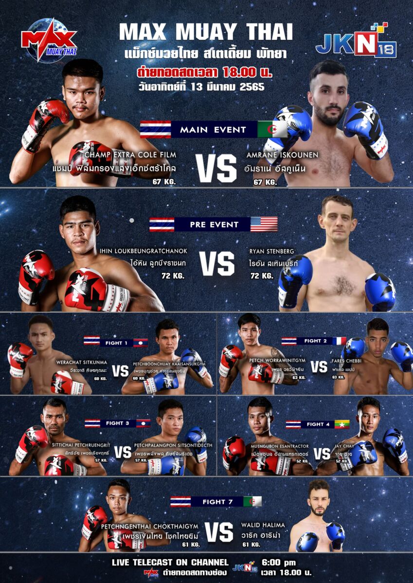 รายการแม็กซ์มวยไทย พบขีดสุดของดีกรีความมันส์กับศึกรวมขุนพลแนวหน้าของไทย ปะทะเดือดนักสู้ต่างชาตินำโดย ขุนเข่าเมืองกะเปอร์ แชมป์ ฟิล์มกรองแสงเอ็กซ์ตร้าโคล เปิดศึกปะทะ อัมราเน่ อีสคูเน่ จากแอลจีเรีย ร่วมด้วย ไอ้หิน ลูกบึงราชนก ขุนเข่าพิฆาตเมืองอรัญ แลกเดือดกับ ไรอัน สเทินเบริก์ จากอเมริกา พร้อมเร้าใจกับคู่มวยสุดระทึกอีกเพียบ ความมันส์ที่คอมวยต้องไม่พลาด ถ่ายทอดสดวันอาทิตย์ที่ 13 มีนาคมนี้ เวลา 18.00 น. เป็นต้นไป