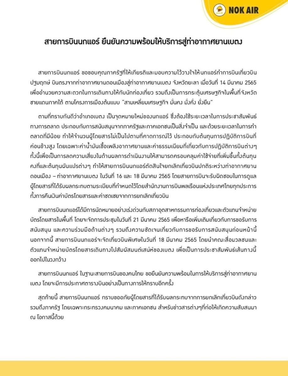 โดยเฉพาะค่าน้ำมันเชื้อเพลิงอากาศยาน และค่าธรรมเนียมที่เกี่ยวกับการปฏิบัติการบินต่าง ๆ ทั้งนี้ เพื่อเป็นการลดความเสี่ยงในด้านผลการดำเนินงานให้สามารถครอบคลุมค่าใช้จ่ายที่เพิ่มขึ้น ทั้งต้นทุนคงที่ และต้นทุนผันแปรต่าง ๆ ทำให้สายการบินนกแอร์ตัดสินใจยกเลิกเที่ยวบินปกติระหว่างท่าอากาศยานดอนเมือง–ท่าอากาศยานเบตง ในวันที่ 16 และ 18 มี.ค. 65 โดยสายการบินจะรับผิดชอบในการดูแลผู้โดยสารที่ได้รับผลกระทบตามระเบียบที่กำหนดไว้โดยสำนักงานการบินพลเรือนแห่งประเทศไทย (กพท.) ทุกประการ ทั้งการคืนเงินค่าบัตรโดยสาร และค่าชดเชยจากการยกเลิกเที่ยวบิน