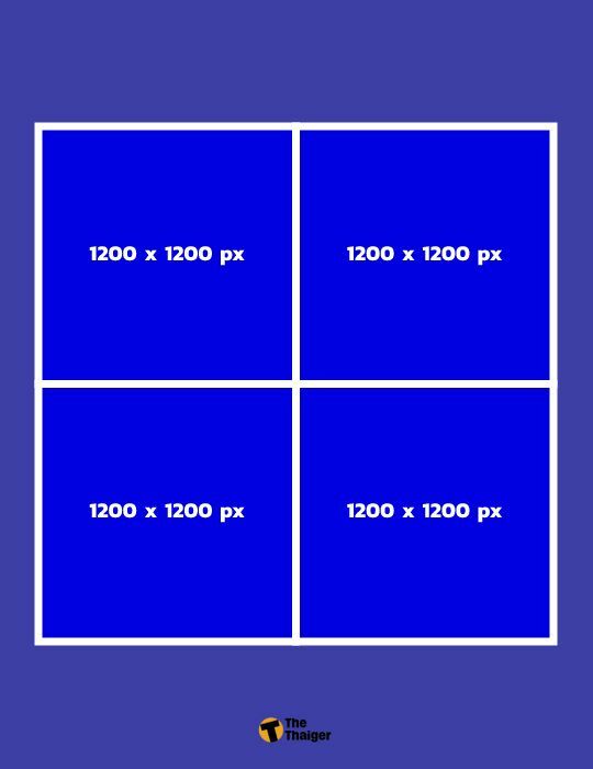 ขนาดรูป Facebook อัลบั้ม จัตุรัส 4 รูป สำหรับการ Post โดยอัตราส่วนภาพที่ให้ความคมชัด ทั้งบนคอมและมือถือคือ 1:1 ขนาดภาพที่ควรใช้คือ 1200 x 1200 px ทั้ง 4 รูป