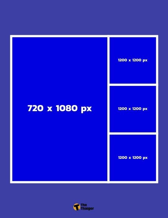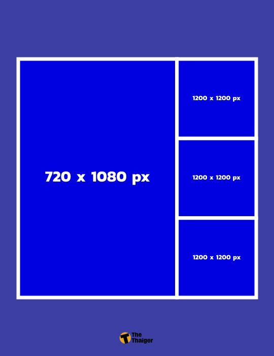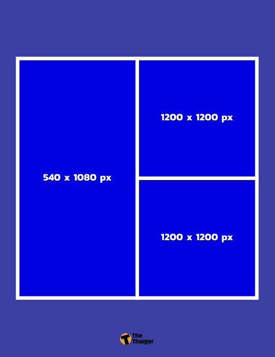 - ขนาดรูป Facebook อัลบั้ม แนวตั้ง 3 รูป สำหรับการ Post โดยอัตราส่วนภาพที่ให้ความคมชัด ทั้งบนคอมและมือถือคือ 1:2 และ 1:1 ขนาดภาพที่ควรใช้คือ 540 x 1080 px / 1200 x 1200 px / 1200 x 1200 px