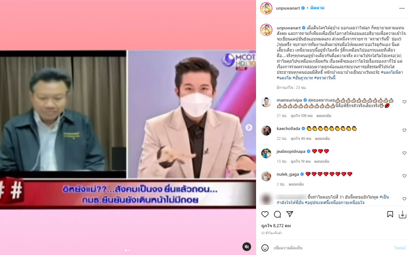 “เมื่อคืนใครได้ดูบ้าง บอกเลยว่าไฟลุก ก็พยายามถามแทนสังคม และการถามก็เพียงเพื่อเปิดโอกาสให้ตอบและอธิบายเพื่อความเข้าใจ จะเขียนแคปชั่นยังแอบหมดแรง ส่วนหนึ่งจากรายการ “ดราม่าวันนี้” ช่อง9 2ทุ่มครึ่ง จบรายการทีมงานเดินมาปรบมือให้ผมเพราะอะไรดูกันเอง นี่แค่เสี้ยวเดียว เหนี่ยวแบบนี้อยู่ชั่วโมงนึง รู้สึกเหมือนไปออกรบเลยทีเดียว