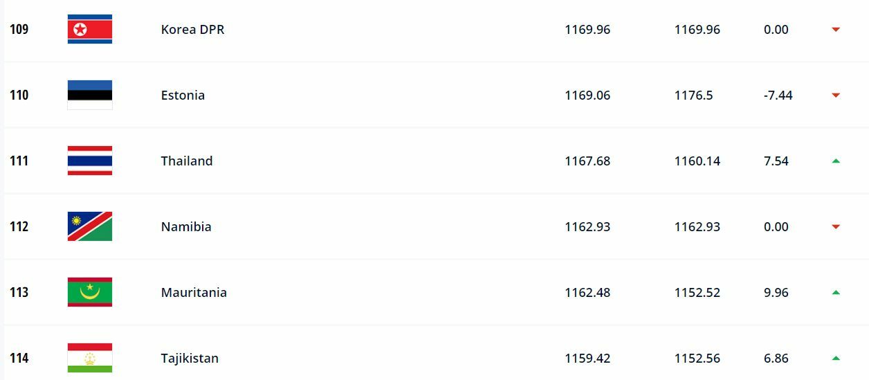 ซึ่งปรากฎว่าทัพ ช้างศึก ทีมชาติไทย ขยับขึ้นจากอันดับที่ 112 มารั้งอยู่ในอันดับที่ 111 ของโลก หลังเก็บคะแนนสะสมเพิ่มได้อีก 7.54 แต้ม จากเกมอุ่นเครื่องที่ชนะ เนปาล 2-0 และชนะ ซูรินาม 1-0 เพิ่มมาเป็น 1,167.68 คะแนน