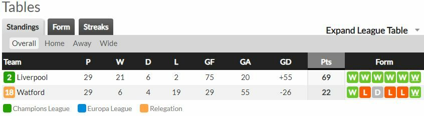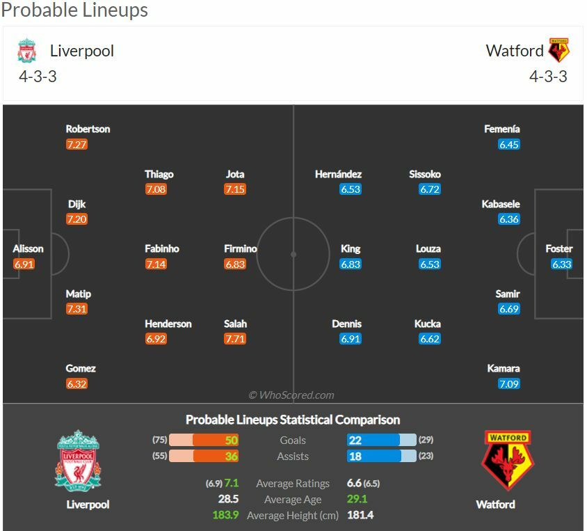 ลิเวอร์พูล ทำผลงานได้ดีอย่างตอ่เนื่อง จนทำแต้มไบ่จี้จ่าฝูงอย่าง แมนซิตี้ เหลือเพยีงแค่แต้มเดียวเท่านั้น ส่วนทางด้าน วัตฟอร์ด เองก็ต้องการแต้มเพื่อเพิ่มโอกาสการอยู่รอด อย่างไรก็ตามด้วยฟอร์มการเล่นและคุณภาพนักเตะ คาดว่าเกมนี้ทัพ หงส์แดง จะเอาชนะทีมเยือนไปได้แบบไม่ยากเย็นนัก และขึ้นไปเป็นจ่าฝูงชั่วคราว