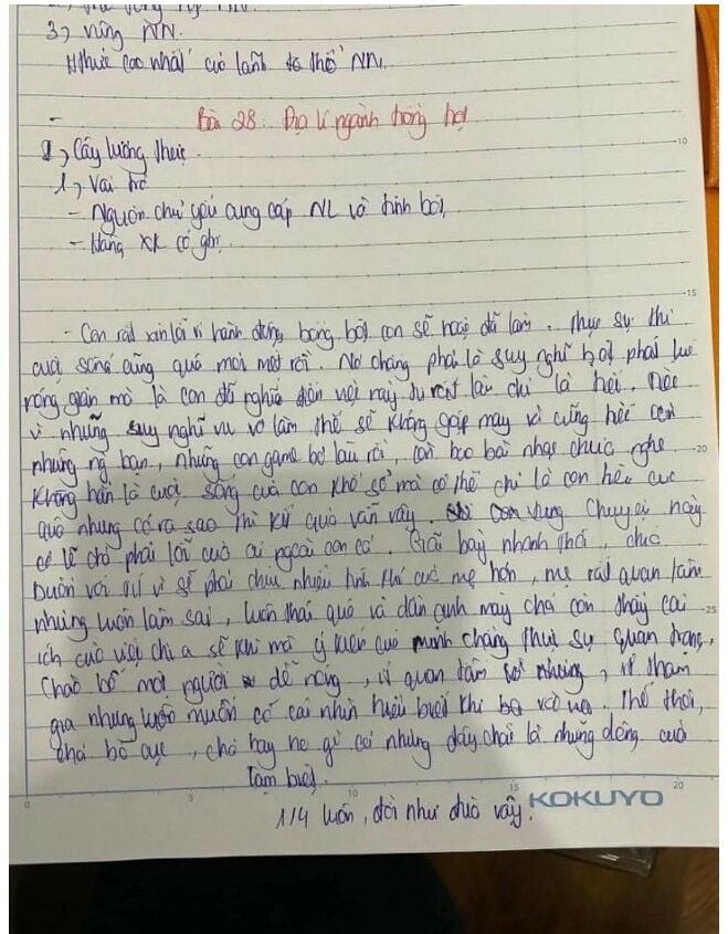 ซึ่งจดหมายลาตายของลูกนั้นถูกเผยแพร่เป็นอย่างมากในสื่อสังคมออนไลน์ โดยเนื้อหาในจดหมายคือ ลูกชายขอโทษครอบครัว พร้อมตัดพ้อว่า ชีวิตของเขาเหนื่อย ซึ่งเขาก็ได้ระบุว่า แม่เป็นคนที่เอาใจใส แต่ทำอะไรไม่ถูกต้อง พร้อมจิกกัดพ่อด้วยว่าเป็นคนที่ไม่ใส่ใจและอารมณ์ร้อน และปิดท้ายจดหมายว่า วันที่ 1 เมษายน ชีวิตเป็นเรื่องหน้าโง่