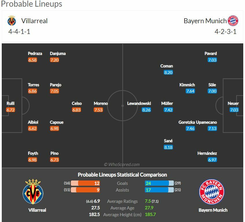 บียาร์เรอัล ผ่านด่านหินอย่าง ยูเวนตุส มาได้ แต่กลายเป็นว่าฟอร์ม 2 นัดหลังสุดแพ้รวด ส่วนทางด้าน บาเยิร์น มิวนิค ยังไม่แพ้ใครตลอด 6 เกมที่ผ่านมา คาดว่าเกมนี้จะเป็นทางฝั่งทัพ เสือใต้ ที่เปิดเกรุกใส่อย่างเต็มสูบ และจะเก็บความได้เปรียบไปก่อนในเกมแรก