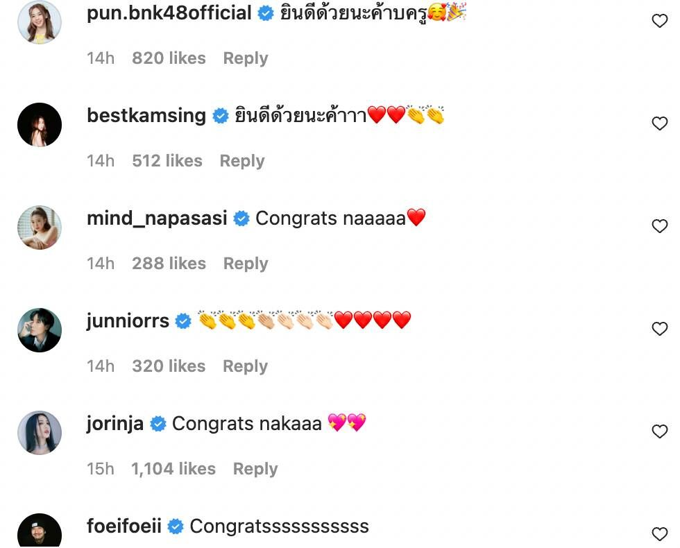 หลังจากที่ภาพนี้ถูกโพสต์ลงไป ก็ได้มีเหล่าคนบันเทิงแห่มายินดีกันเพียบ ๆ ไม่ว่าจะเป็นแก็งค์เพื่อนจากมหาวิทยาลัยอย่าง ก้อย อรัชพร, ดรีม อภิชญา และ วี วิโอเลท นอกจากนี้ยังมีคนดังอีกมากมายมาร่วมยินดี อาทิ ใหม่ ดาวิกา, อิงค์ วรันธร, เบสท์ รักษ์วนี, ปุ้มปุ้ย พรรณทิภา, พลอย หอวัง, โอบ นิธิ และ พิมฐา