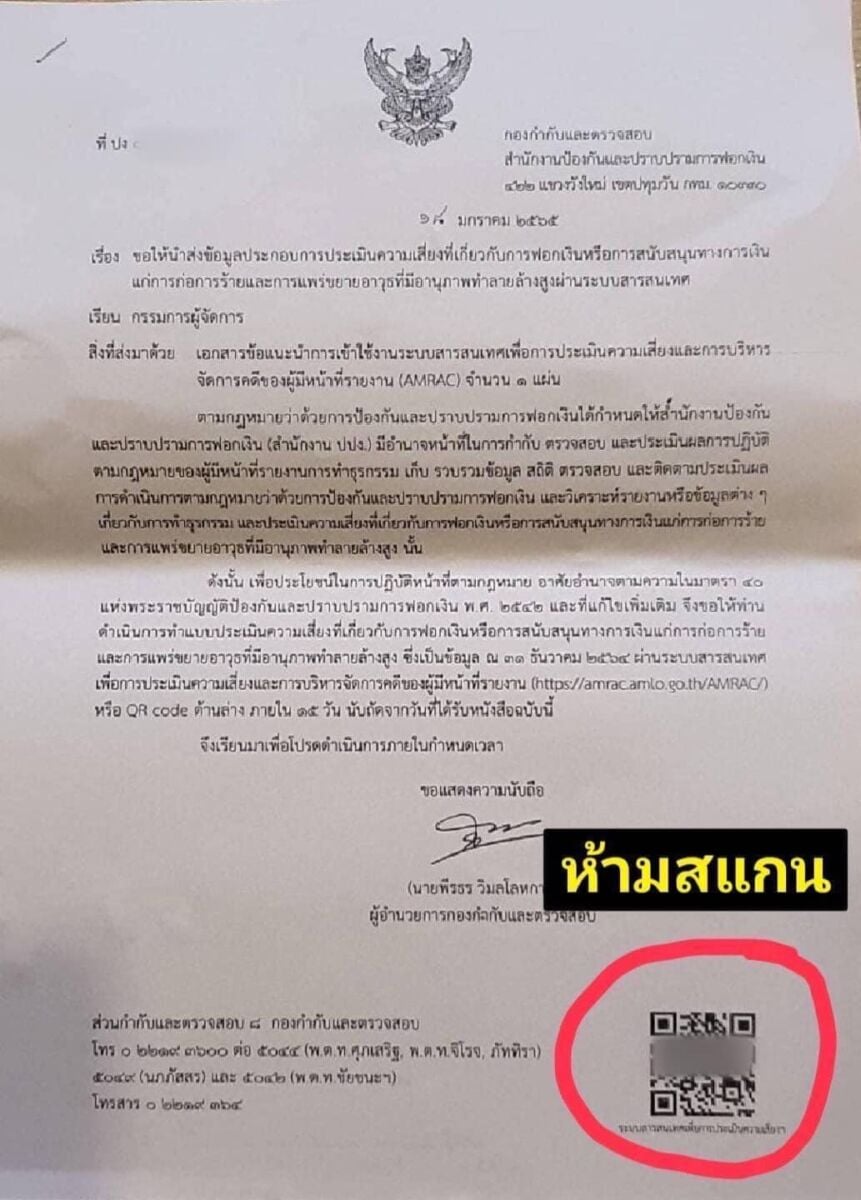 ของกองกำกับและตรวจสอบ สำนักงานป้องกันและปราบปรามการฟอกเงิน ฉบับลงวันที่ 18 มกราคม 2565 ที่มีถึงกรรมการผู้จัดการของนิติบุคคลรายหนึ่งเพื่อให้ประเมินความเสี่ยงที่เกี่ยวกับการฟอกเงิน และใช้ข้อความสื่อว่าเป็นเอกสารปลอม ที่กระทำโดยแก๊งคอลเซ็นเตอร์ จนสังคมเกิดความสับสนนั้น กรมสอบสวนคดีพิเศษ ได้ตรวจสอบแล้ว พบว่า
