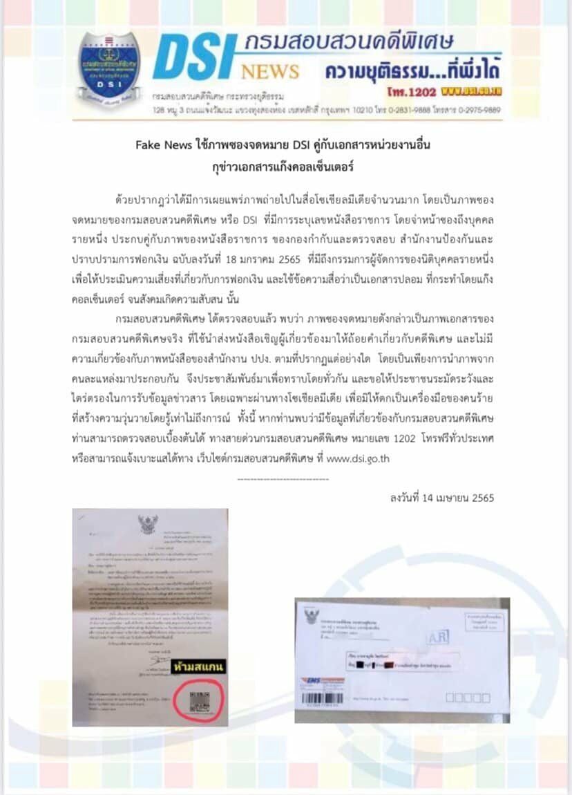 แจ้ง Fake News ภาพซองจดหมาย DSI คู่กับเอกสารหน่วยงานอื่น กุข่าวปลอมแก๊งคอลเซ็นเตอร์