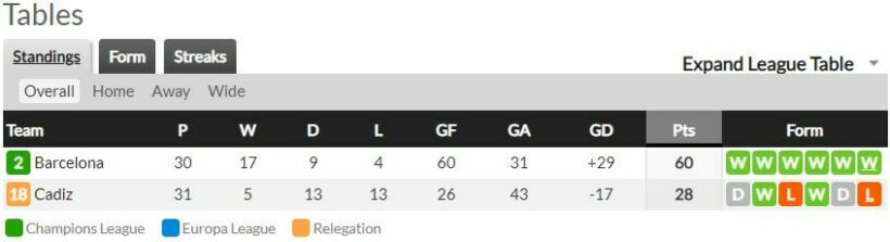 อันดับในตารางล่าสุดของทั้งสองทีม :