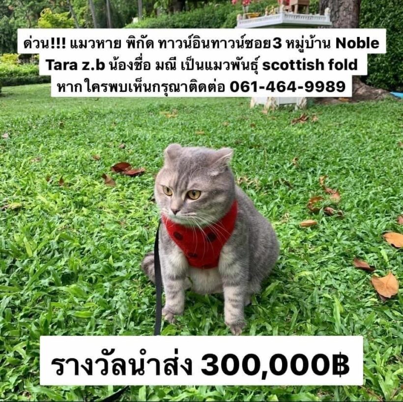 เพจเฟซบุ๊ก Kingdom Of Tigers: ทูนหัวของบ่าว ได้ออกมาโพสต์ข้อความเฟซบุ๊ก ประชาสัมพันธ์และขอความช่วยเหลือในการตามหา แมวพันธุ์สกอตติชโฟลด์ขนสั้น ลายสลิดสีเทา ชื่อ มณี หลังจากที่แมวตัวดังกล่าวหลุดออกไปเมื่อวันที่ 17 เมษายน ที่ผ่านมา โดยมีรางวัลเป็นเงิน 3 แสนบาท