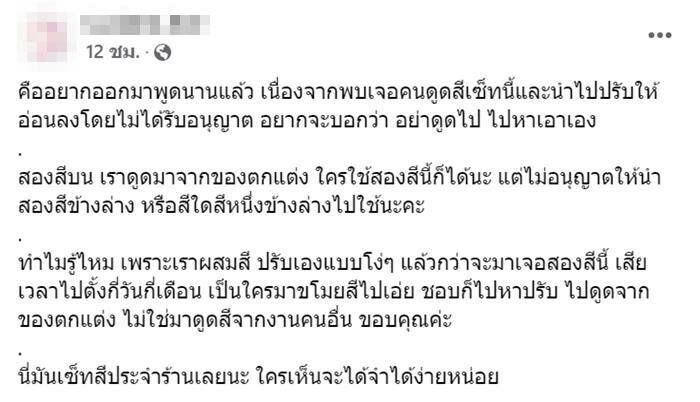 โดยข้อความระบุว่า “คืออยากออกมาพูดนานแล้ว เนื่องจากพบเจอคนดูดสีเซ็ตนี้ และนำไปปรับให้อ่อนลงโดยไม่ได้รับอนุญาต อยากจะบอกว่า อย่าดูดไป ไปหาเอาเอง ซึ่ง 2 สีบน เราดูดมาจากของตกแต่ง ใครใช้สองสีนี้ก็ได้นะ แต่ไม่อนุญาตให้นำ 2 สีข้างล่าง หรือสีใดสีหนึ่งข้างล่างไปใช้