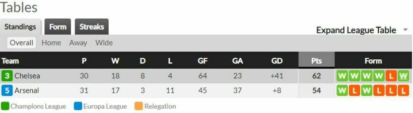อันดับในตารางล่าสุดของทั้งสองทีม :