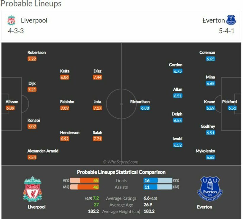 รายชื่อผู้เล่น 11 ตัวจริง ลิเวอร์พูล เอเวอร์ตันที่คาดว่าจะลงสนาม (Whoscored.com) :