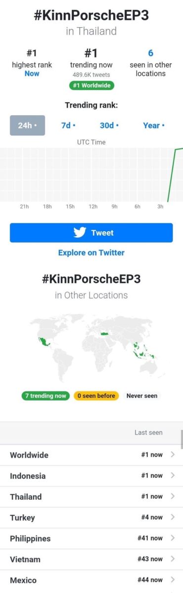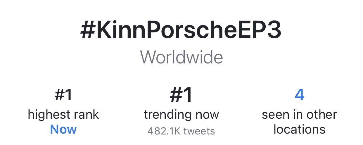 ซึ่งหลังจาก KinnPorsche The Series (คินน์ พอร์ช เดอะซีรีส์) ออนแอร์ต่อเนื่องเป็นสัปดาห์ที่ 3 แล้ว โดยใน Ep.3 ที่ผ่านมาส่งผลให้ #KinnPorscheEp3 ติดเทรนด์ทวิตเตอร์อันดับ 1 ของโลก ในช่วงออกอากาศ งานนี้ทำเอา นักแสดงนำ และทีมงานผู้ผลิต ถึงกับปลื้มใจ สุด ๆ ที่แฟนๆต่างให้การตอบรับที่ดี