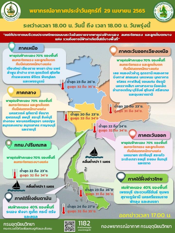 สภาพอากาศวันนี้ พยากรณ์อากาศวันนี้ 30 เมษายน 2565 พายุฤดูร้อนถล่มทุกจังหวัดทั่วไทย ฝนฟ้าคะนองร้อยละ 70 ของพื้นที่ ขอประชาชนเฝ้าระวังภัย