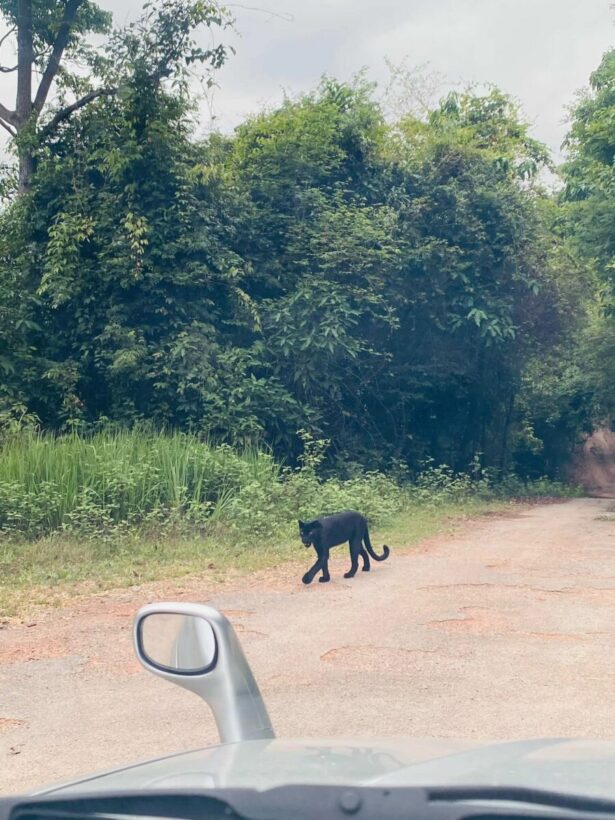 เพลิดเพลินไปสักพักใหญ่ๆ มาถึงกลางทาง เจอเงาดำๆ ตะคุ่มๆ กำลังกินน้ำที่ขังอยู่กลางถนนดิน เรารีบชะลอรถ เพื่อดูให้แน่ชัดว่าคือตัวอะไร?! และเมื่อเพ่งชัดๆ สิ่งที่เห็นนั้นคือ …… “เสือดำ” เสือดำจ้าแม่ อ่านไม่ผิดดดดด ขนลุกไปหมดดด ตกใจมากกกก ไม่คิดว่าจะเจอ