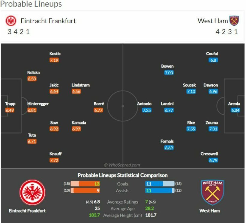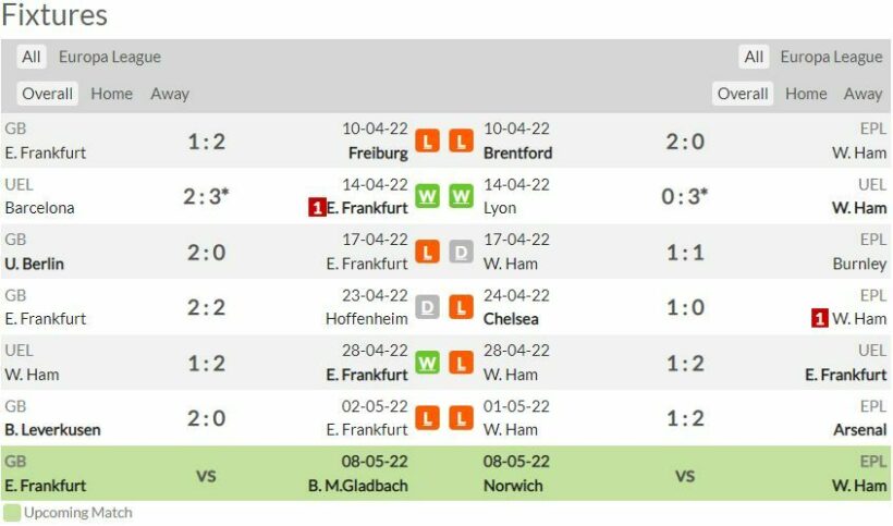 แฟรงค์เฟิร์ต ยังทำผลงานได้ไม่ค่อยคงเส้นคงวาสักเท่าไรนัก มีทั้งชนะ, แพ้ และเสมอ ตลอด 6 เกมล่าสุด ส่วนทางด้าน เวสต์แฮม 6 เกมล่าสุด ชนะได้เพียงแค่เกมเดียว และแพ้ไปถึง 4 เกม อย่างไรก็ตามคาดว่าเกมนี้ทัพขุนค้อนจะใช้ทุกอย่างที่มีโหมโจมตีใส่เจ้าบ้านอย่างหนัก และคาดว่าทีมเยือนจะเป็นฝ่ายกำชัยใน 90 นาที ก่อนจะไปตัดสินกันในช่ววต่อเวลาพิเศษ
