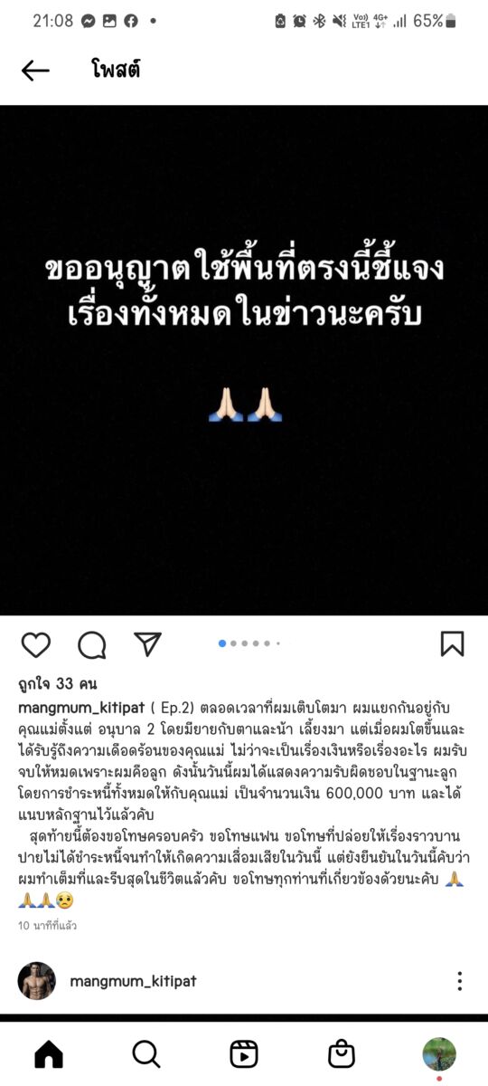สุดท้ายนี้ต้องขอโทษครอบครัว ขอโทษแฟน ขอโทษที่ปล่อยให้เรื่องราวบานปายไม่ได้ชำระหนี้จนทำให้เกิดความเสื่อมเสียในวันนี้ แต่ยังยืนยันในวันนี้คับว่า ผมทำเต็มที่และรีบสุดในชีวิตแล้วคับ ขอโทษทุกท่านที่เกี่ยวข้องด้วยนะคับ …