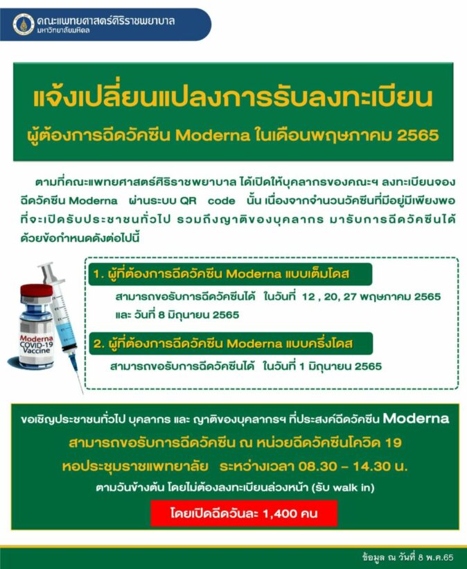 คณะแพทยศาสตร์ศิริราชพยาบาล จึงขอเชิญประชาชนทั่วไป บุคลากรคณะแพทยศาสตร์ศิริราชพยาบาล และญาติของบุคลากรฯ ที่ประสงค์ฉีดวัคซีน Moderna สามารถขอรับการฉีดวัคซีน ณ หน่วยฉีดวัคซีนโควิด-19 หอประชุมราชแพทยาลัย ได้ระหว่างเวลา 08.30-14.30 น. ตามวันข้างต้น โดยไม่ต้องลงทะเบียนล่วงหน้า (รับ walk in) โดยเปิดฉีดวันละ 1,400 คน”