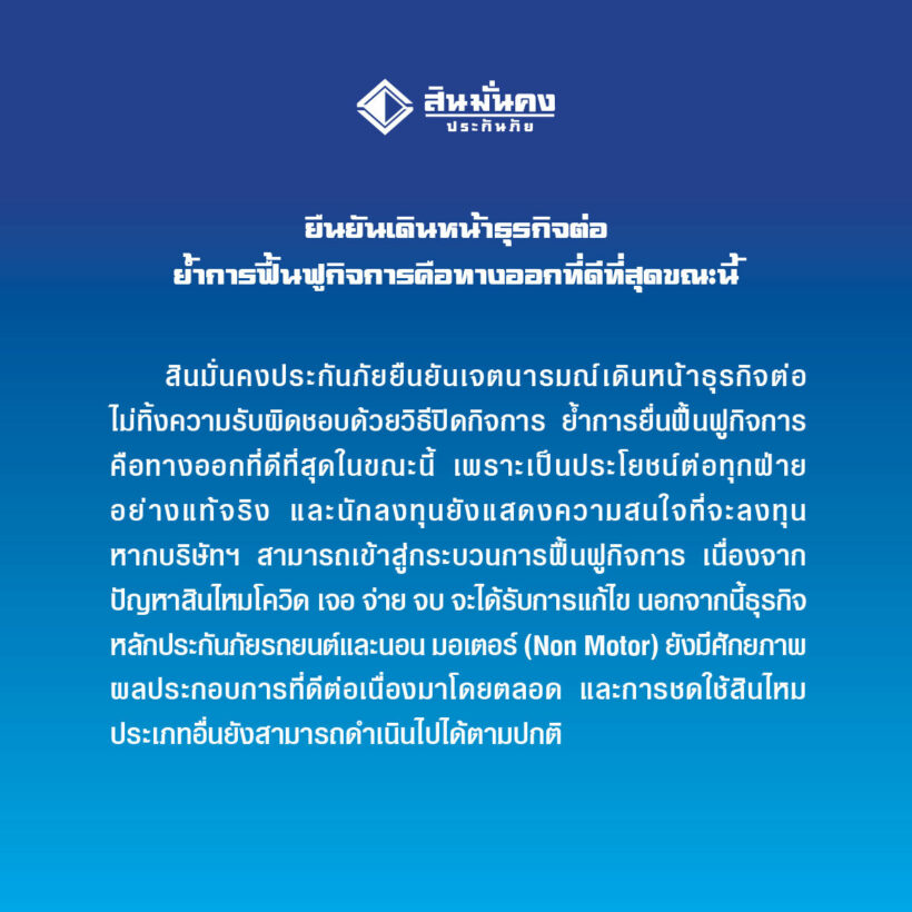 บริษัทฯ สินมั่นคงประกันภัย มีความมุ่งมั่นที่จะแก้ไขปัญหาภาระหนี้ค่าสินไหมโควิด ด้วยการฟื้นฟูกิจการเพื่อประโยชน์สูงสุดของทุกฝ่าย บริษัทฯ รู้สึกซาบซึ้งที่ทุกฝ่ายมีความเข้าใจและให้การสนับสนุนกิจการของบริษัทฯ มาโดยตลอด และหวังเป็นอย่างยิ่งว่าจะได้รับความร่วมมือเพื่อก้าวผ่านอุปสรรคครั้งใหญ่ของบริษัทฯ ในครั้งนี้ และจะทำให้บริษัทฯ สามารถกลับมาประกอบการอย่างแข็งแกร่ง เพื่อให้บริการอย่างมีคุณภาพและส่งเสริมกิจกรรมด้านสังคมดังที่บริษัทฯ ได้ยึดมั่นตลอดมาได้ต่อไป
