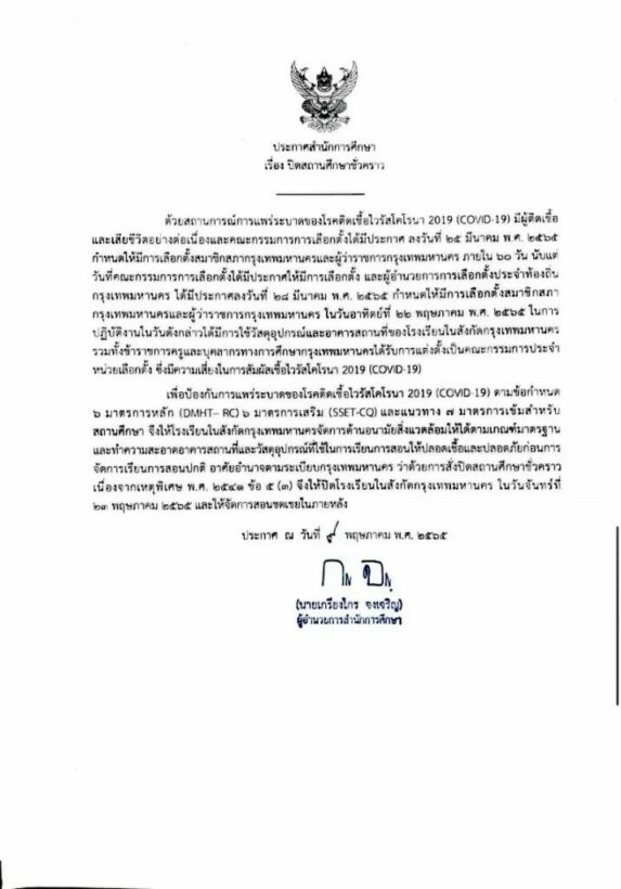 กรุงเทพเซ็นอนุมัติคำสั่ง ปิดเรียน 23 พ.ค. หนึ่งวัน หลังเลือกตั้งผู้ว่า เพื่อทำความสะอาด ลดความเสี่ยงของโรคโควิด-19