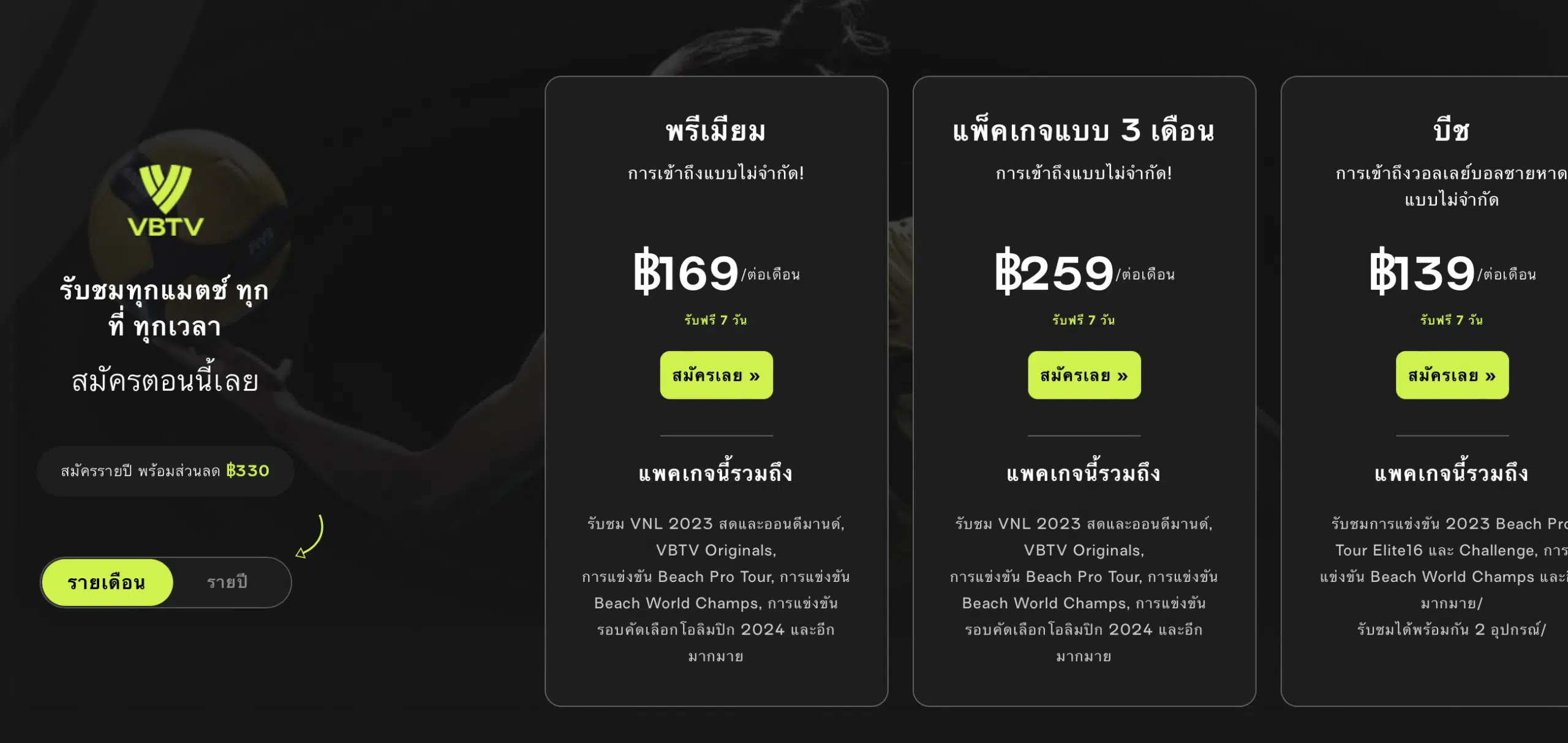 แผนการสมัคร VBTV มีแบบรายเดือน รายปี และ ดูวอลเลย์บอลชายหาด ราคาจะแตกต่างกันไป รายละเอียดตามภาพ