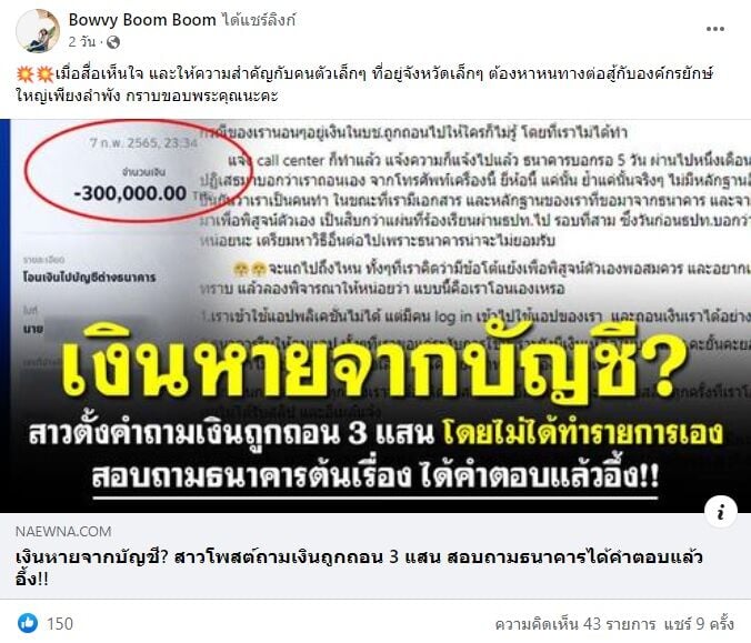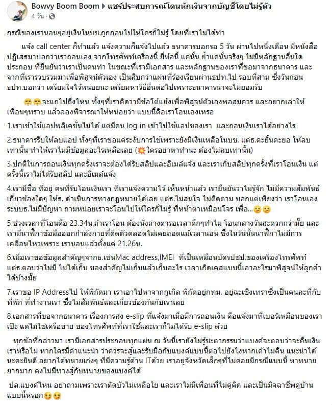 เมื่อวันที่ 28 พ.ค. 2565 เวลา 09.43 น. ในโลกออนไลน์จากเฟซบุ๊กกลุ่ม “แชร์ประสบการณ์โดนหักเงินจากบัญชีโดยไม่รู้ตัว” พบหญิงสาวรายหนึ่งใช้เฟซบุ๊ก “Bowvy Boom Boom” โพสต์เล่าถึงสถานการณ์ที่ตนกำลังเผชิญอยู่หลังจากเงินฝากในธนาคารหายไป 3 แสนบาท โดยระบุรายละเอียดว่า “กรณีของเรานอนๆอยู่เงินในบช.ถูกถอนไปให้ใครก็ไม่รู้ โดยที่เราไม่ได้ทำ”