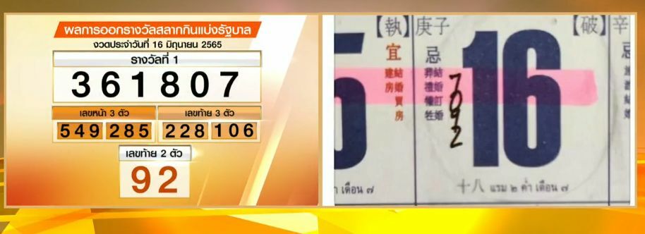 โดยเลขที่ปรากฏบนปฏิทินจีน เป็นเลข 7092 ซึ่งก็เรียงตามผลลอตเตอรี่รางวัลที่ 1 ที่ออก 361807 และรางวัลเลขท้าย 2 ตัว ที่ออก 92 ด้านน้องไบรท์ก็ไม่รอช้า เปิดปฏิทินจีน งวดวันที่ 1 กรกฎาคม 2565 โชว์ให้แฟน ๆ รายการเรื่องเล่าเช้านี้ดูกันต่อทันที