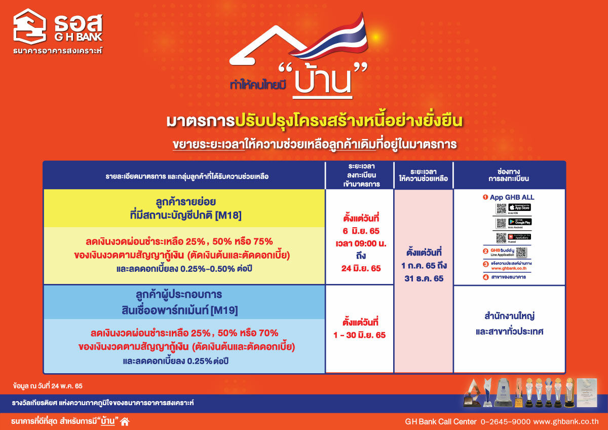 (17 มิ.ย. 2565) ธนาคารอาคารสงเคราะห์ (ธอส.) จัดทำ มาตรการปรับปรุงโครงสร้างหนี้ อย่างยั่งยืน เฟส 2 ช่วยเหลือลูกค้าที่อยู่ในมาตรการที่ 18 และ 19 และยังได้รับผลกระทบด้านรายได้จาก COVID-19 สามารถขยายระยะเวลาความช่วยเหลือต่อเนื่องตั้งแต่ 1 กรกฎาคม – 31 ธันวาคม 2565