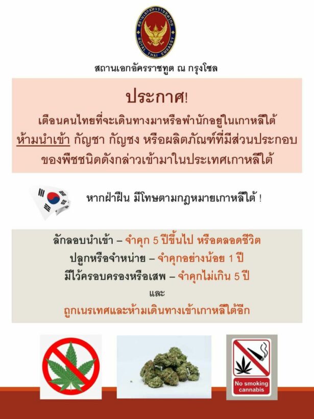 ข้อความระบุว่า “ประกาศ ! เตือนคนไทยที่จะเดินทางมาหรือพำนักอยู่ในเกาหลีใต ห้ามนำเข้า กัญชา กัญชง หรือผลิตภัณฑ์ที่มีส่วนประกอบของพืชชนิดดังกล่าวเข้ามาในประเทศเกาหลีใต้ หากฝ่าฝืน จะมีโทษตามกฎหมายเกาหลีใต้