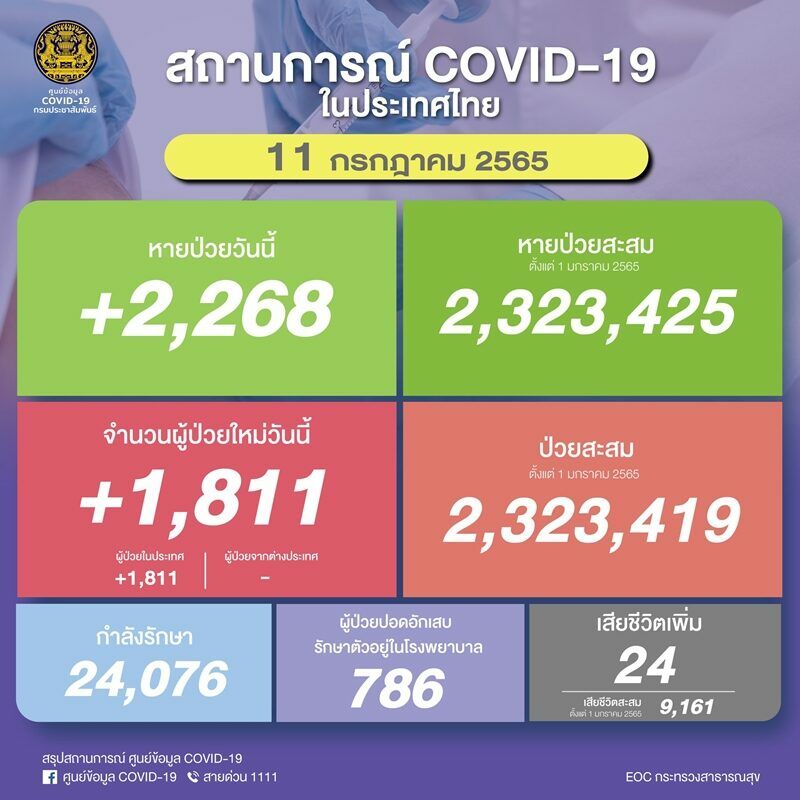 โควิดไทยวันนี้ ล่าสุด 11 ก.ค.65 ติดเชื้อเพิ่ม 1,811 ราย อัปเดตสถานการณ์แพร่ระบาดของโรคโควิด-19 ล่าสุด เสียชีวิตเพิ่ม 24 ราย หายป่วย 2,268 ราย