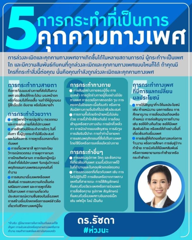 รัชดา รองโฆษกสำนักนายก จากพรรคประชาธิปัตย์ โพสต์ คุกคามทางเพศ ไม่ควรเป็นเรื่องแค่ในองค์กร กรณี อานุภาพ ธารทอง ถูกแจ้งความ