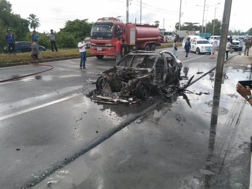 เกิดเหตุระทึกขึ้นเมื่อ ไฟไหม้รถเบนซ์ ขณะที่นักธุรกิจขับรถมาจากกรุงเทพ คนขับรอดพร้อมเผยว่าไม่มีเหตุผิดปกติก่อนเกิดไฟไหม้