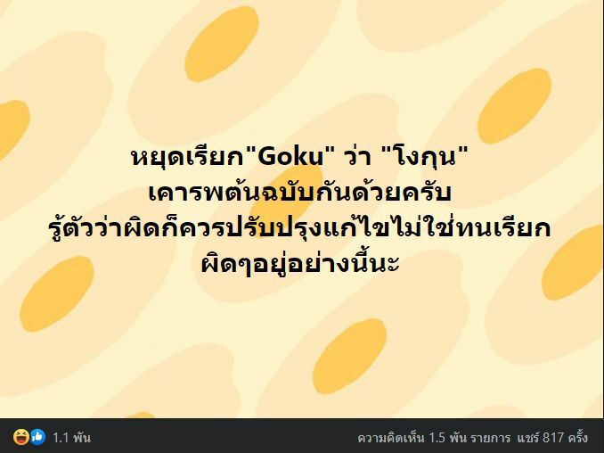 วันที่ 19 ก.ค. 2022 มีสามากชิกเฟซบุ๊ก Anime Thailand ได้โพสต์ข้อความว่า หยุดเรียก ‘Goku‘ ว่า ‘โงกุน‘ เคารพต้นฉบับกันด้วยครับ รู้ตัวว่าผิดก็ควรปรับปรุงแก้ไขไม่ใช่ทนเรียกผิดๆอยู่อย่างนี้นะ ทำให้โพสต์ดังกล่าวกลายเป็นประเด็นไวรัลขึ้นมาในทันที เข้ามาแสดงความคิดเห็นกันอย่างมาก