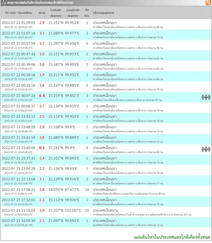 กรมอุตุนิยมวิทยา เปิดเผยว่าพบเหตุแผ่นดินไหวเชียงใหม่ 2 ครั้ง ขนาด 5.1 ในช่วงเวลาประมาณ 23.40 น. ของวันพฤหัสบดีที่ 21 กรกฎาคม และ 6.4 ในช่วงเวลา 00.07 น. ของวันศุกร์ที่ 22 กรกฎาคม รวมไปถึงอาฟเตอร์ช็อกอีกหลายครั้ง จนไปถึงช่วงเวลาประมาณ 1.09 น.